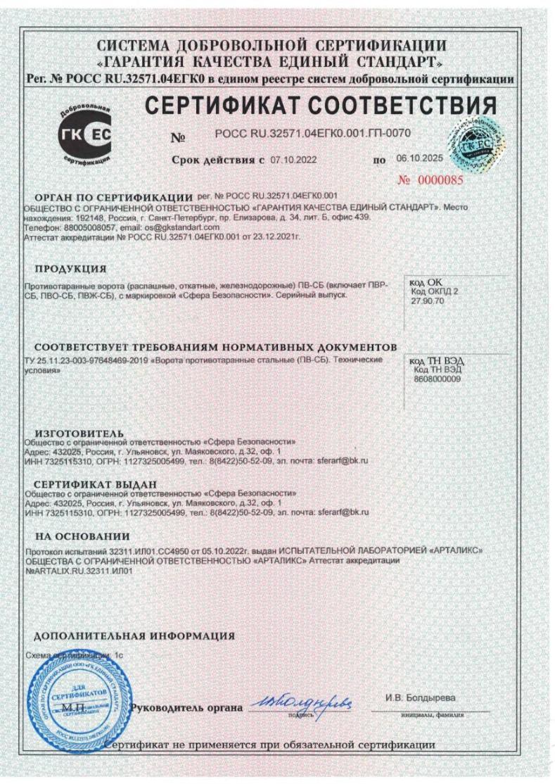 Наше производство соответствует требованиям, предъявляемым к современным производствам металлоконструкций. Все изделия на каждом этапе их производства проходят технологический контроль. После сборки и подключения автоматики устройства тщательно проверяются на соответствие техническим условиям и паспорту на изделие и признаются годными для эксплуатации. Технология нашего производства сводит к минимуму вероятность брака. ООО "Сфера Безопасности" прошло проверку и получило сертификат системы менеджмента качества ИСО 9001, который подтверждается ежегодным инспекционным контролем. Все наши изделия получили сертификат соответствия Техническим условиям, зарегистрированным ФГУП "Стандартинформ".